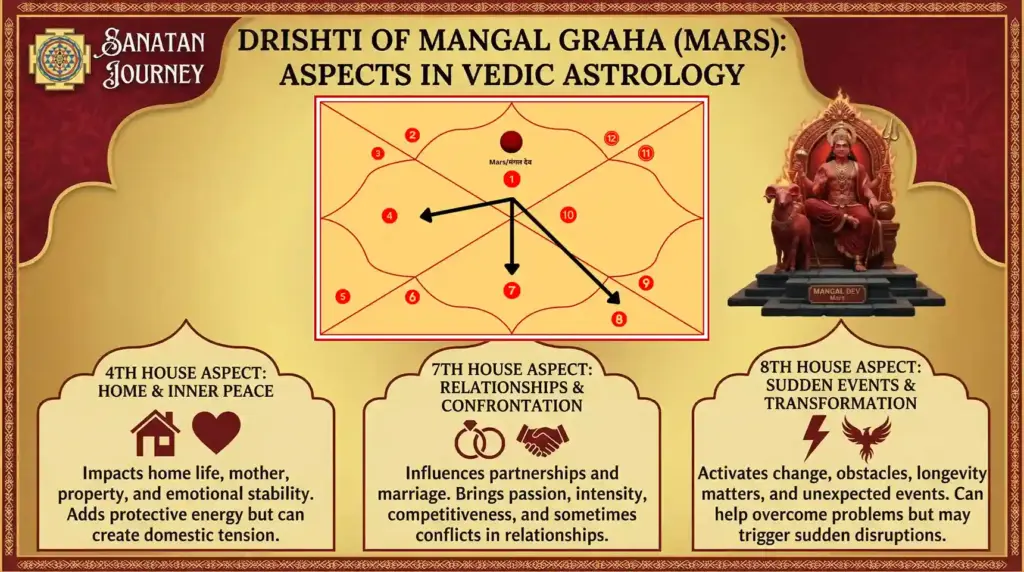 Most planets only look at the house directly opposite to them (the 7th house). But Mars is special. It has extra “special aspects” that make it very powerful.