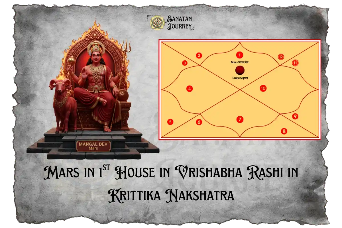 Disclaimer: This is a general analysis of the result of Mars in 1st House in Vrishabha Rashi in Krittika Nakshatra. The information provided is intended solely for educational and informational purposes. It is not a definitive or personalized prediction. For an accurate and comprehensive kundali (horoscope) analysis, the native is strongly advised to consult a qualified professional astrologer.