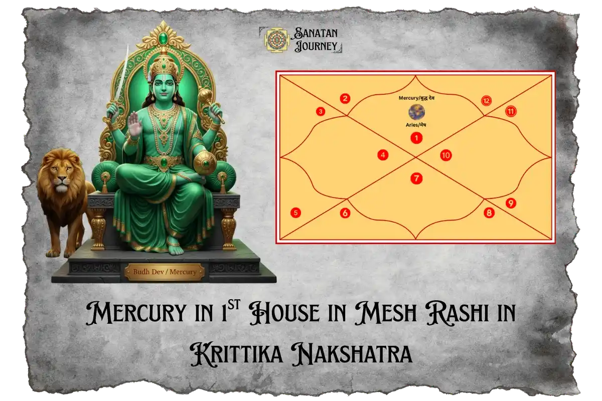 Mercury in the 1st house indicates a person whose self-expression is defined by intellect and speech. When positioned in Mesh Rashi (Aries), the first sign of the Kalpurush Kundali representing the head, the mind becomes sharp and active. Mercury in 1st house in Mesh Rashi in Krittika Nakshatra brings a unique energy.