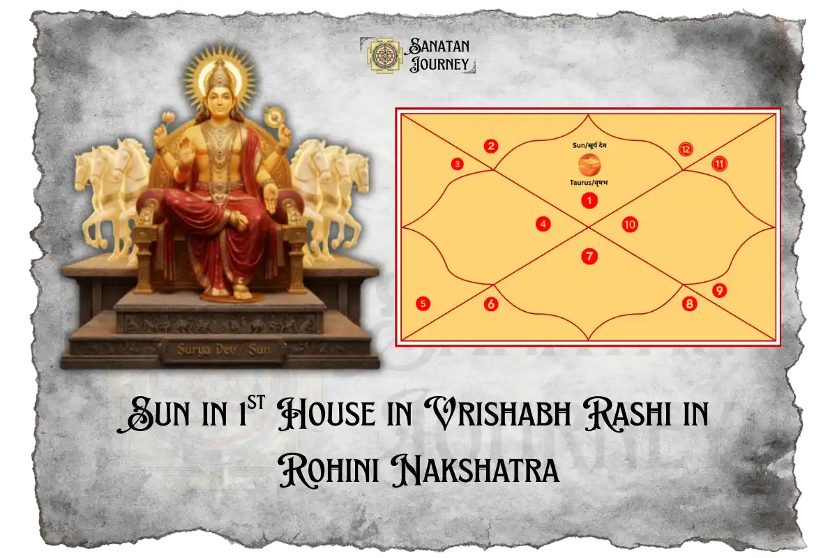 Do you want to know what happens with the Sun in 1st house in Vrishabha Rashi in Rohini Nakshatra? This placement puts the Sun in 1st House, which represents your self and vitality. Here, the Sun sits in Sun in Taurus (Vrishabha), mixing its hot, bossy energy with the steady, earthy nature of Vrishabha Rashi.